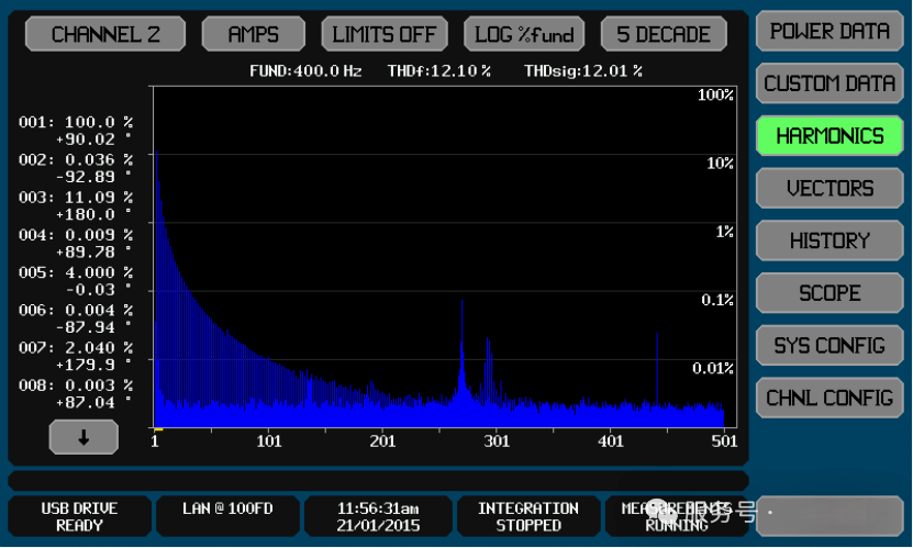 1.谐波分析功能强大:为满足先进的电力谐波要求,PA900/910/920系列在航空电源频率下可显示多达500次谐波。用户可通过直观的图表设置,选择线性、相对线性、对数或相对对数幅度显示。此外,还能轻松触摸谐波条,选择八个谐波进行幅度和相位的数值显示,并可导入谐波限制,使超出公差的谐波在图表中以红色醒目显示,方便用户快速识别和分析谐波问题。