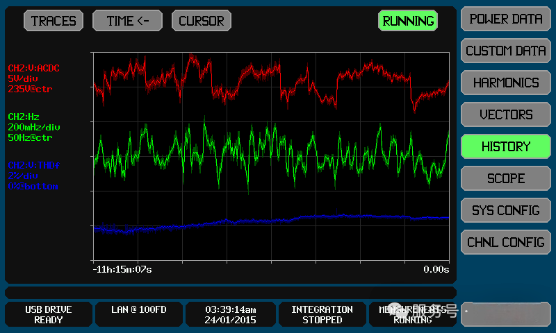 历史屏幕(图6)则自动记录所有非谐波测量结果和选定谐波,用户可选择最多四个参数进行图形化显示,记录时间最长可达397 天,可随意缩放查看,还配备了方便的光标操作,便于数据追溯和分析。