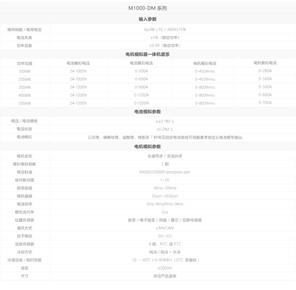 M1000-DM系列一体机是一款集高效率、高精度、高动态性于一体的智能化电池及电机模拟装置,实现超高功率密度,大幅降低产品体积和重量。