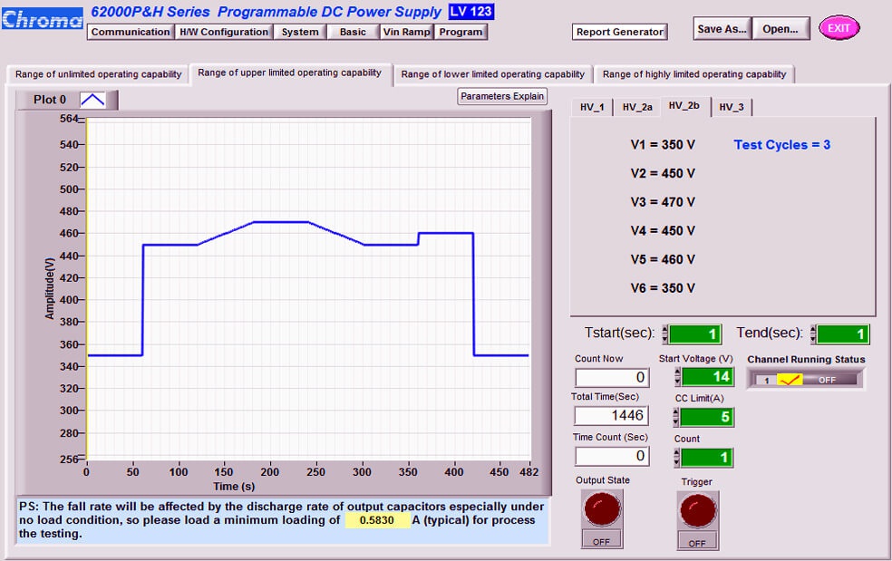 除了整合国际ISO 16750-2及车厂GS 95024-2-1及VW 80000标准外,还纳入LV 123于此汽车环境电力负载试验软件,LV 123为欧系各大车厂编订于新能源汽车的电气特性测试,针对其高压系统零件,定义其操作电压范围内的状态标准,此图形化人机接口软件可简易联机控制直流电源供应器提供图形化测试曲线进行测试,此非常适合研发及品保单位对 LED头灯、车用音响、GPS、高压电池系统、逆变器、DC/DC高低压转换器、车载充电器...等车用电子产品做长时间性能及稳定性验证。