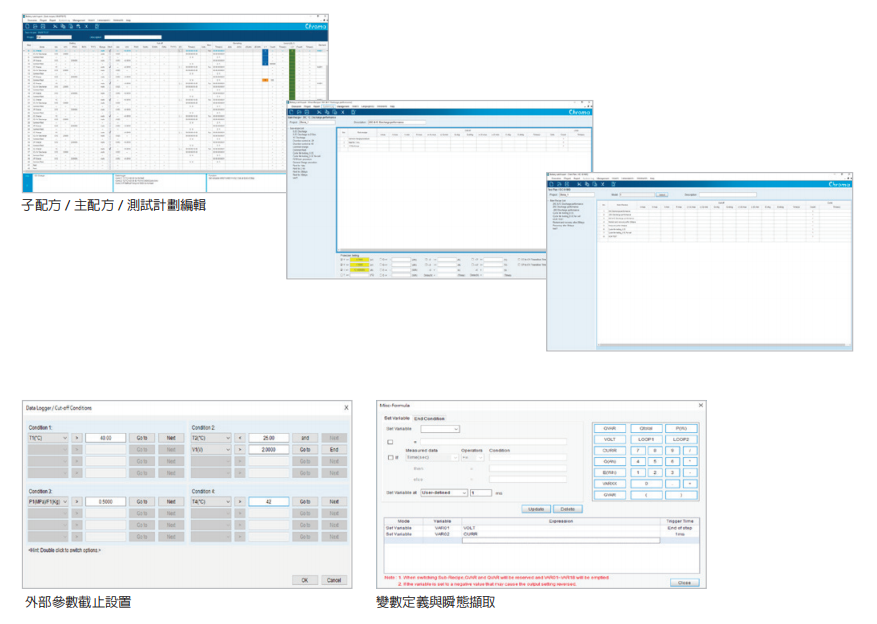 • 变数编辑功能:搭配外部数据记录器可测量电压、温度、与压力,以进行弹性编程与复杂应用。