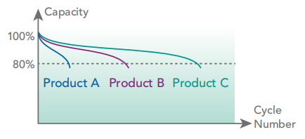 循环寿命为电池最重要的测试项目之一,依据不同实验目的,以重覆的充放电条件测试同一个电池,直到容量衰退至原先80%并计算可循环次数。而循环寿命试验可用来评鉴电池性能优劣或定义适合的使用条件。
