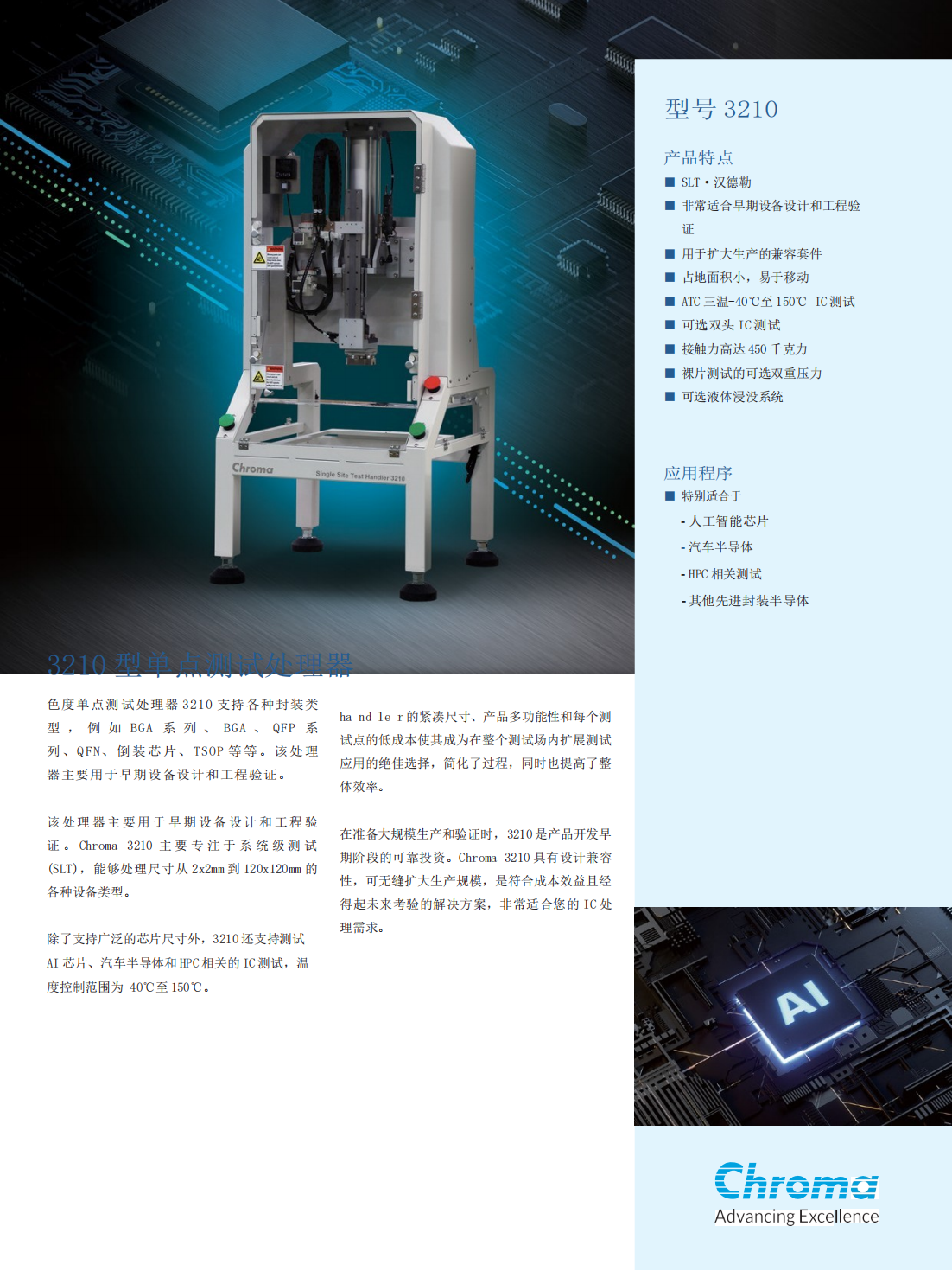 色度单点测试处理器 3210 支持各种封装类型 , 例 如 BGA 系 列 、 BGA 、 QFP 系列、QFN、倒装芯片、TSOP 等等。该处理器主要用于早期设备设计和工程验证。